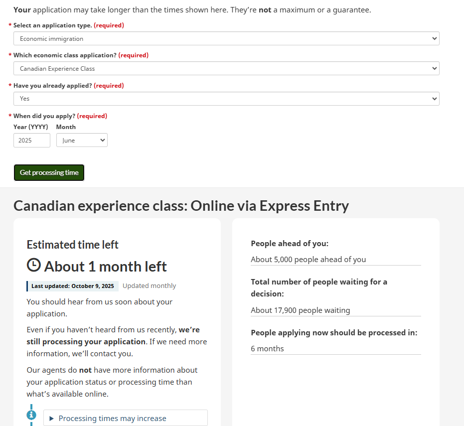 就在加拿大当地时间2025年10月10日,加拿大移民局官网悄然上线了一款工具,这款工具的功能是什么呢?主要就是可以根据申请人apply的时间去计算精确的当期审理周期,以及你前方有多少人排队,一共有多少人排队,以及现在apply的话排队周期是多久。