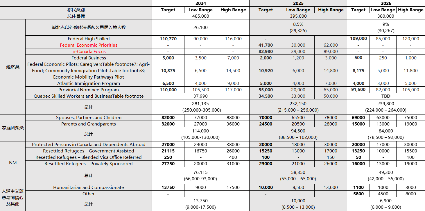 该分类主要包括了如CEC、FSW、定向通道如技工通道等联邦EE通道,2026年配额109,000,基本与2024年移民高峰时配额(110,770)持平,未来EE仍然会作为加拿大联邦移民的基石,但这里需要注意的是法语通道配额上涨会吃掉部分份额,另外加上今年年内提及的管理类EE新通道也有望在2026年开通,总体来看EE仍是加拿大移民的优选,但对申请人的个人条件包括语言等可能有一定的要求。