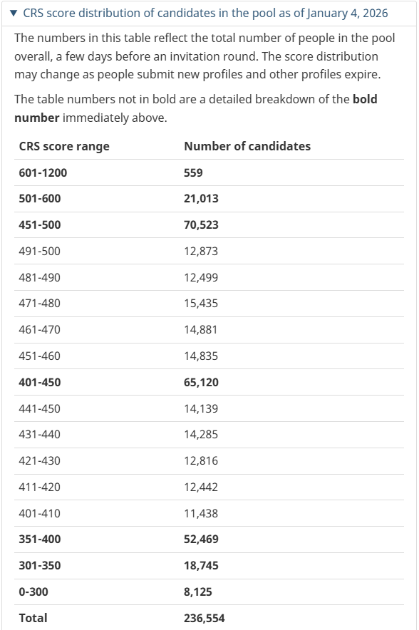 根据2026年1月4日IRCC更新的Express Entry入池数据:
