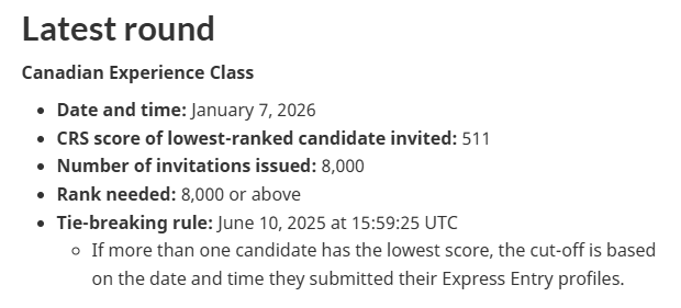 加拿大移民、难民及公民部(IRCC)于2026年1月举行了本年度第二次Express Entry(快速通道)抽签,本轮为加拿大经验类(CEC)专项邀请,共向8,000名候选人发出永久居民申请邀请(ITA)。