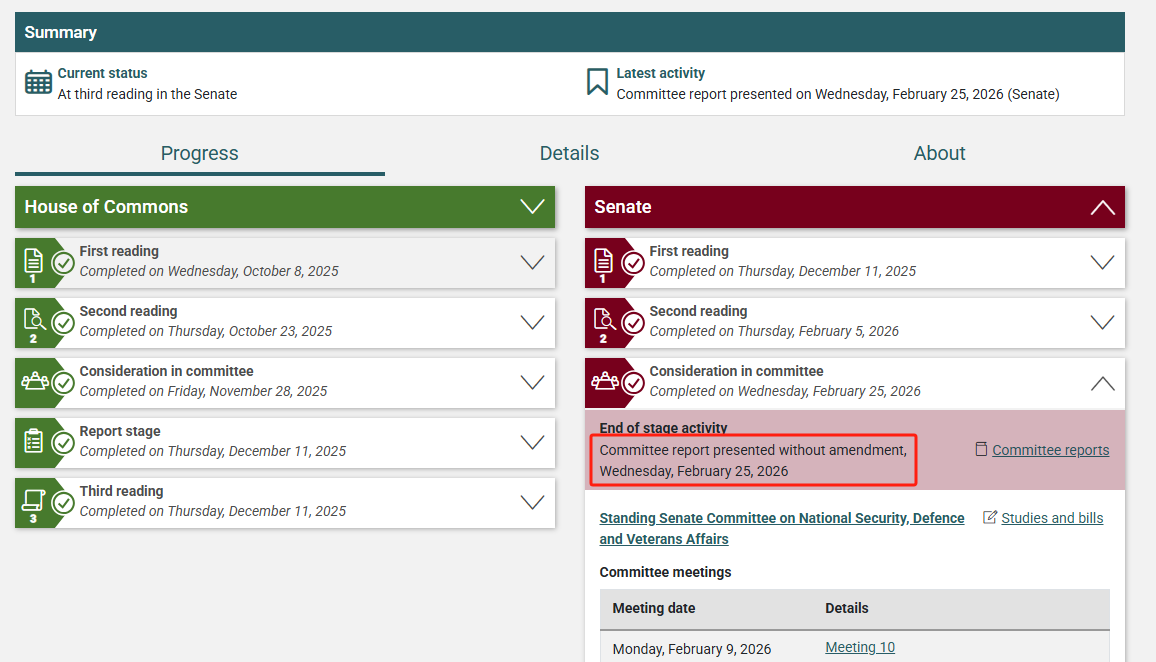 因此于加拿大当地时间2026年2月25日,委员会提出的修正建议未被采纳,C-12法案未经调整已被参议院委员会上报参议院审议,预计能在未来几周内完成第三次审读并送交最终御准成为法律。