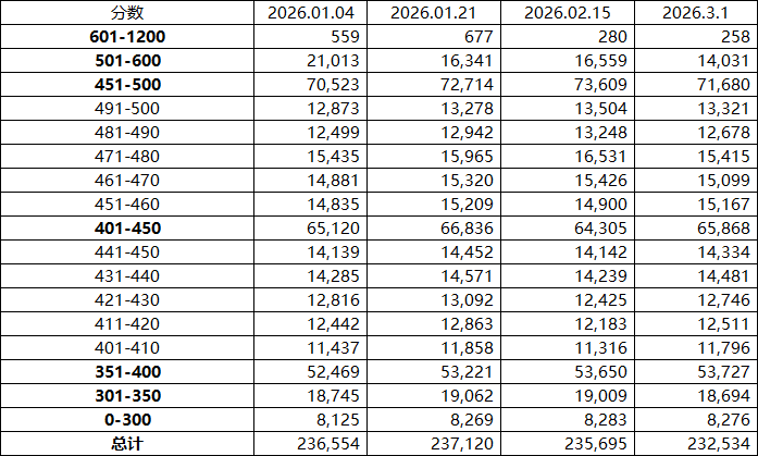 501-600分段主要是CEC高分候选人,其中CEC 2026年一共抽了4轮,分数从511下降到508。