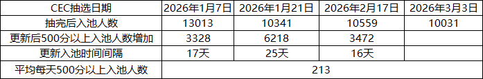 加拿大联邦EE与2026年3月4日再次抽分,共计抽取了4000人,分数为508分,和上一次6000人的抽选最低分数保持一致。从2026年以来的入池人数和CEC抽分的人数来看: